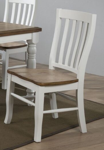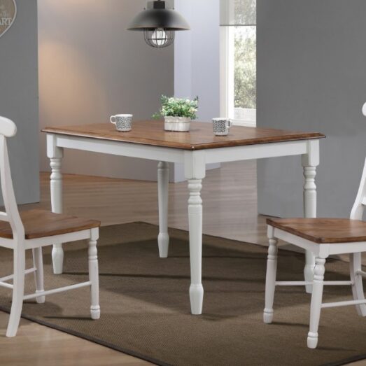 Made from solid hardwood, simplicity in design, subtle accents and charming, farmhouse two tone White and Rustic Brown finish come together to create this finely crafted collection. Sold with the Rake Back chair in the store.